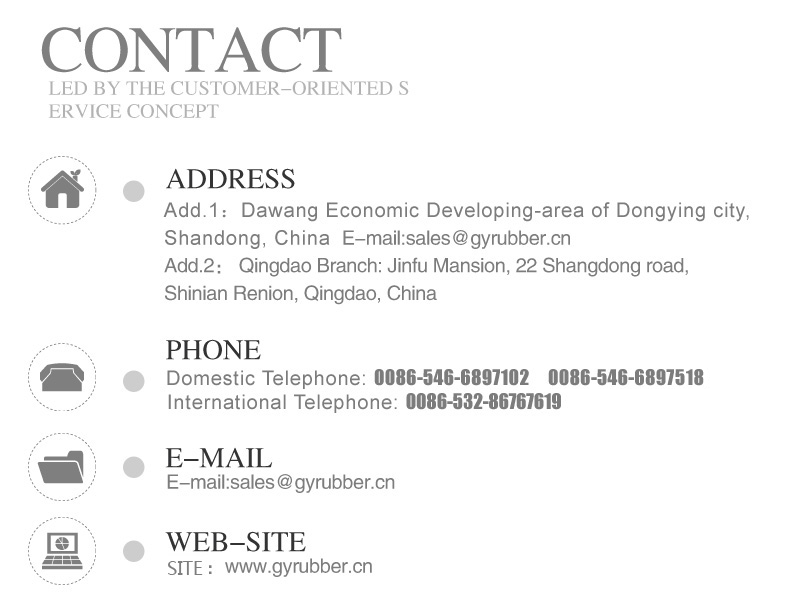 Add.1: Dawang Economic Developing-area of Dongying city, Shandong, ChinaAdd.2: Qingdao Branch: Jinfu Mansion, 22 Shandong road, Shinian region, Qingdao, China.E-mail:sales@gyrubber.cn Domestic Telephone: 0086-546-6897102、0086-546-6897518International Telephone: 0086-532-86767619